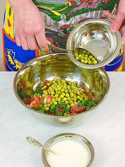 С консервированного зеленого горошка слить жидкость, добавить горошек к помидору и петрушке.