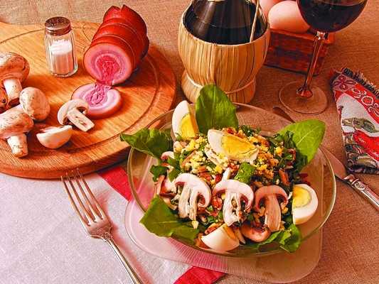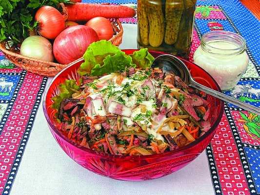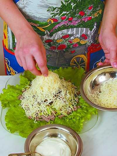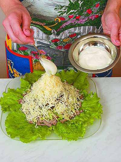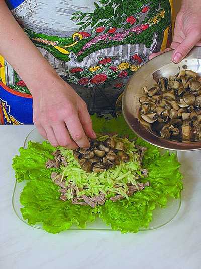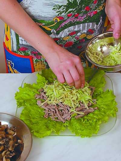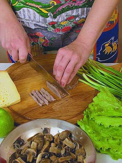 в салатницу. Шампиньоны или другие грибы промыть под проточной водой, затем положить в кастрюлю и поставить варить на медленном огне. Отваренные грибы остудить, затем не очень мелко нарезать кубиками или соломкой. Нарезанные шампиньоны поместить следующим слоем в салатницу. Сыр натереть на мелкой терке и положить в салатницу на слой грибов. Приготовленный салат заправить майонезом, украсить зеленым луком и подать к столу.Филе говядины отварить, остудить, мелко нарезать соломкой и положить в салатницу.