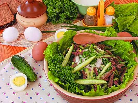 100 г говяжьей печени, 1 яйцо, 1 свежий огурец, 2 ст. ложки майонеза, 1 ст. ложка растительного масла, листья салата, зелень петрушки, зеленый лук, соль, перец черный молотый.