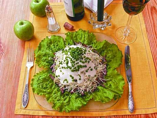 80 г говядины, 30 г сельди, 1 клубень картофеля, 1 маринованный огурец, 1/2 красного яблока, 1/2 помидора, 1 яйцо, 1 ст. ложка майонеза, 1 ст. ложка горчицы, листья салата, зелень укропа, соль, перец черный молотый.