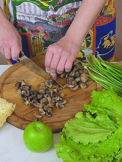 100 г говядины, 50 г шампиньонов, 1 зеленое яблоко, 70 г сыра, 2 ст. ложки майонеза, 1 ч. ложка лимонного сока, листья салата, зеленый лук.