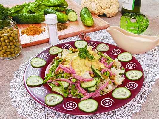 70 г ветчины, 70 г цветной капусты, 1 огурец, 30 г консервированной стручковой фасоли, 20 г консервированного зеленого горошка, 2 ст. ложки майонеза, 1/4 ч. ложки карри, листья салата, зелень петрушки, соль, перец черный молотый.
