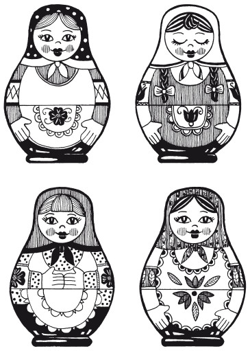 Это более сложный вариант предыдущего упражнения. Ребенку нужно внимательно рассмотреть рисунки (рис. 3) и найти различия между матрешками. Так как дошкольнику трудно сравнивать сразу четыре предмета, можно ему помочь, задавая вопросы: одинаковые ли волосы у матрешек? Одинаковые ли платочки, глазки, ручки?