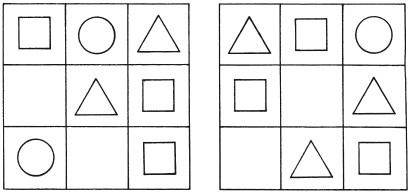 Играют двое. Каждый игрок должен изучить расположение фигур в таблице (рис. 5), обращая внимание не только на их форму, но и на цвет (усложнение по сравнению с предыдущей игрой), найти закономерность в их расположении и заполнить пустые. Победителем