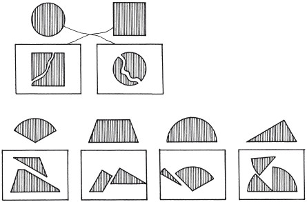 Инструкция ребенку: посмотри внимательно на рисунок 25. В нем даны два ряда фигур. В первом ряду находятся целые фигуры, а во втором ряду эти же фигуры, но разбитые на несколько частей. Попытайся мысленно соединить части фигур во втором ряду и ту фигуру, которая у тебя при этом получится. Найди в первом ряду фигуры первого и второго ряда, подходящие друг к другу, соедини их линией.