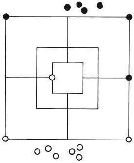 В ней принимают участие два ребенка. Для игры понадобится бумага, карандаш, 10 белых и 10 красных фишек. Сначала нужно расчертить бумагу и расставить на ней все фишки, как показано на рисунке 33.