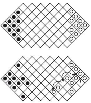 Игроки по очереди передвигают свои фишки в противоположном направлении. Можно ставить фишку на пустую клетку или перепрыгивать через другую фишку, если за ней имеется свободная клетка, при этом ходить можно как через свои фишки, так и через фишки противника.