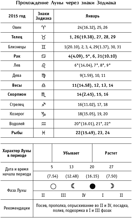 Пользоваться этим календарем просто и удобно. Выбираете подходящий в вашем регионе срок посева или посадок того или иного растения. Смотрите под приведенной таблицей прохождения Луны через знаки Зодиака в нужном вам месяце, в какой именно фазе Луны вы будете сеять либо сажать свои растения. Если следуете знакам Зодиака, то найдите в таблице дни, набранные жирным шрифтом, которые попадают в выбранную вами фазу Луны. Вот они то и считаются наиболее подходящими. Звездочкой отмечены дни, которые в настоящее время считаются неблагоприятными. Кроме того, звездочкой отмечены дни новолуния и полнолуния, а также время за 12 часов до их наступления и 12 часов после, поскольку считается, что это неблагоприятное время для работ на огороде и в саду. Дополнительно для овощей все дни, когда Луна находится в знаке Льва, считаются неблагоприятными, поэтому