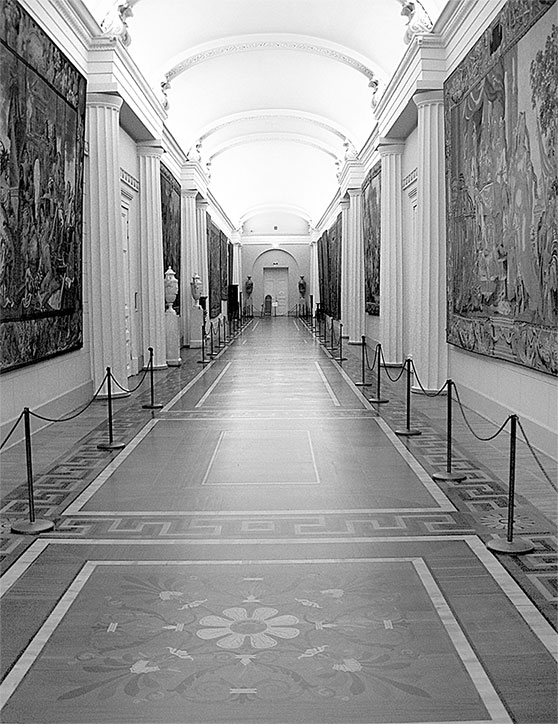 Темный коридор Зимнего дворца идеально подходил для размещения шпалер работы XVI в., поскольку в этом коридоре не было окон и они не выцветали от солнечного света.