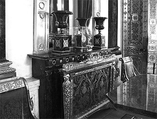 Совершенно очевидно, что так Николай II именовал первую от Малахитовой гостиной приемную императрицы Александры Федоровны (зал № 187). Подобная приватная беседа с германским послом, буквально в квартире царя, с одной стороны, являлась свидетельством сохранявшихся близких отношений между Россией и Германией, а с другой – свидетельствовала об определенных неудобствах, вызванных исторически сложившейся планировкой личных половин в северо-западном ризалите. Гораздо логичнее и естественнее проводить подобную часовую беседу с послом было либо в кабинете императора (зал № 181), либо в Готической библиотеке (зал № 178), однако для этого пришлось бы провести гостя из Малахитовой гостиной через спальню царской четы, что было не совсем удобно. Поэтому царю приходилось использовать для приватных бесед одну из парадных гостиных своей жены.