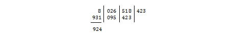 Правило моего отца состояло в том, чтобы поместить самый правый период под следующим и произвести вычитание, поместив остаток вновь под следующим периодом и так далее. В последнем периоде вычитание производится вверх ногами, если нижнее число окажется большим. В нашем примере, поскольку мы имеем 1, которая переносится в последний период, число 931 следует читать как 932. Конечный остаток, 924, есть наше проверочное число, и поскольку оно делимо на 7 и на 11, то исходное число также на них делится.