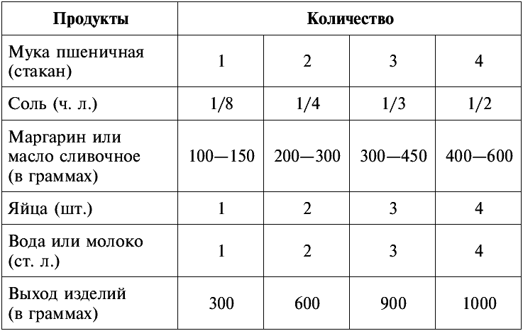 Масло или маргарин разминают до получения пластичной массы, а соль растворяют в воде и соединяют все продукты вместе. В течение 3–5 минут замешивают тесто и формуют его в виде кирпичика. Кладут тесто на посыпанный мукой стол или разделочную доску, посыпают сверху мукой и раскатывают в прямоугольную лепешку толщиной 10 миллиметров. Тесто складывают в четыре раза и еще раз раскатывают и снова складывают вчетверо – тесто готово к выпечке. Приготовление слоеного теста рекомендуется производить на холоде или из охлажденных продуктов. Вместо воды или молока можно добавлять яйцо или яичный желток, и тогда тесто получается более пышным и нежным.