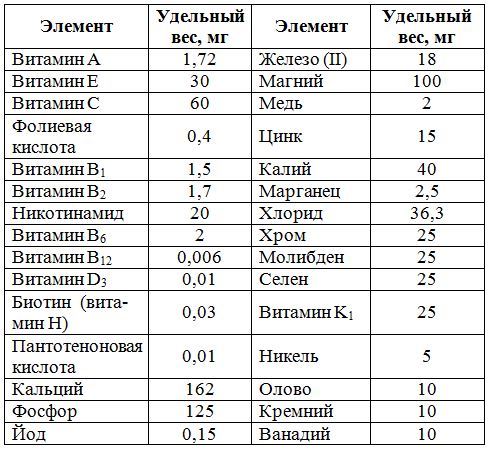 Таким образом, на этапе тренировки антиоксидантной системы не лишним, а скорее необходимым, будет добавить в рацион питания витаминный комплекс с микроэлементами. Сегодня широко доступны десятки витаминных препаратов, например Vitrum, Miltitabs и другие. Нужен тот, который содержит весь комплекс веществ, определенный витаминологами как ежедневная необходимая норма. Привожу для ориентировки наиболее сбалансированный состав препарата Vitrum производства американской компании Unipharm Inc. (табл. 2).