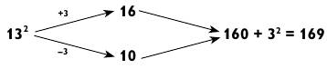 Затем я осознал, что данная последовательность может облегчить операцию возведения чисел в квадрат. Предположим, я хочу возвести в квадрат число 13. Почему бы, вместо того чтобы умножать 13 х 13, не получить приближенный ответ, используя два числа, которые легче перемножить и которые в сумме дают тоже 26? Я выбрал 10 х 16 = 160. Чтобы получить итоговый ответ, я просто прибавил 32 = 9 (так как 10 и 16 дают разность 3 с числом 13) к числу 160. Таким образом, 132 = 160 + 9 = 169. Все четко!
