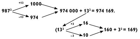 Произведение 92 х 96 = 8832 можно посчитать разными способами. Чтобы отпраздновать окончание данной главы, применим некоторые из уже изученных нами методов. Я начну с самого, на мой взгляд, сложного, а закончу самым простым. По методу сложения (90 + 2) х 96 = 8640 + 192 = 8832; по методу вычитания 92 х (100 — 4) = 9200 — 368 = 8832; по методу разложения 92 х 6 х 4 х 4 = 552 х 4 х 4 = 2208 х 4 = 8832; по результатам возведения в квадрат 942 — 22 = 8836 — 4 = 8832; по методу совместной близости с основанием 90: (90 х 98) + (2 х 6) = 8820 + 12 = 8832; и по методу совместной близости с основанием 100: (100 х 88) + (–8 х –4) = 8800 + 32 = 8832.