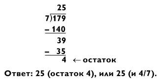 нужно найти такое число Q, которое 7 раз по Q составит 179. Очевидно, что поскольку 179 находится между 7 х 10 = 70 и 7 х 100 = 700, Q должно размещаться между 10 и 100. Стало быть, ответ является двузначным числом. Зная это, сначала определяем наибольшее кратное 10, которое может быть умножено на 7 и в итоге оказаться меньше 179. Нам известно, что 7 х 20 = 140 и 7 х 30 = 210, значит, ответ будет в диапазоне «20 плюс». Отталкиваясь от этого, мы уже можем реально проговорить число «20», так как это будет часть ответа, и она точно не изменится. Далее вычитаем 179–140 = 39. Теперь наша задача сведена к делению 39 х 7. Так как 7 х 5 = 35, что на 4 меньше 39, у нас появилась вторая часть ответа «5» с остатком 4, или, если вы предпочитаете говорить так: 25 и 4/7. Вот как выглядит данный процесс деления [3] .3