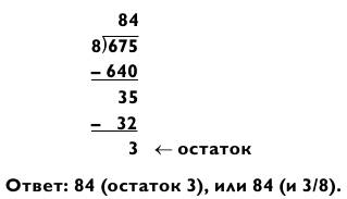 Как и раньше, если 675 находится между 8 х 10 = 80 и 8 х 100 = 800, то ответ должен быть меньше 100 и выражаться двузначным числом. Чтобы произвести деление, учтем, что 8 х 80 = 640 и 8 х 90 = 720. То есть ответ должен быть в диапазоне 80 «с хвостиком». Но с каким хвостиком? Чтобы это узнать, вычтите 640 из 675 для получения остатка 35. После произнесения вами «80» наша задача сведется к 35 : 8. Так как 8 х 4 = 32, итоговый ответ будет 84 с остатком 3, или 84 и 3/8.