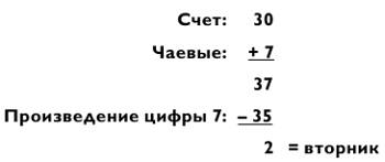 Например, давайте выясним, каким днем недели будет 1 января 2030 года. Возьмите две последние цифры года и представьте себе, что это ваш счет в ресторане (в данном случае 30 долларов.) Теперь добавьте 25 % чаевых, но излишки в центах оставьте себе. (Это можно вычислить, дважды разделив счет пополам и отбросив всю «мелочь». Половина от 30 равна 15, а половина от 15 — 7,50. Оставив излишки себе, получим чаевые в размере 7 долларов.) Отсюда следует, что ваш счет плюс чаевые составляет 37 долларов. Чтобы определить день недели, вычитаем из этой суммы наиболее близкое к ней (но не большее) произведение числа 7 (0, 7, 14, 21, 28, 35, 42, 49, …) и получаем в результате порядковый номер дня. В данном примере, 37–35 = 2, значит, 1 января 2030 года приходится на второй день недели, то есть на вторник.