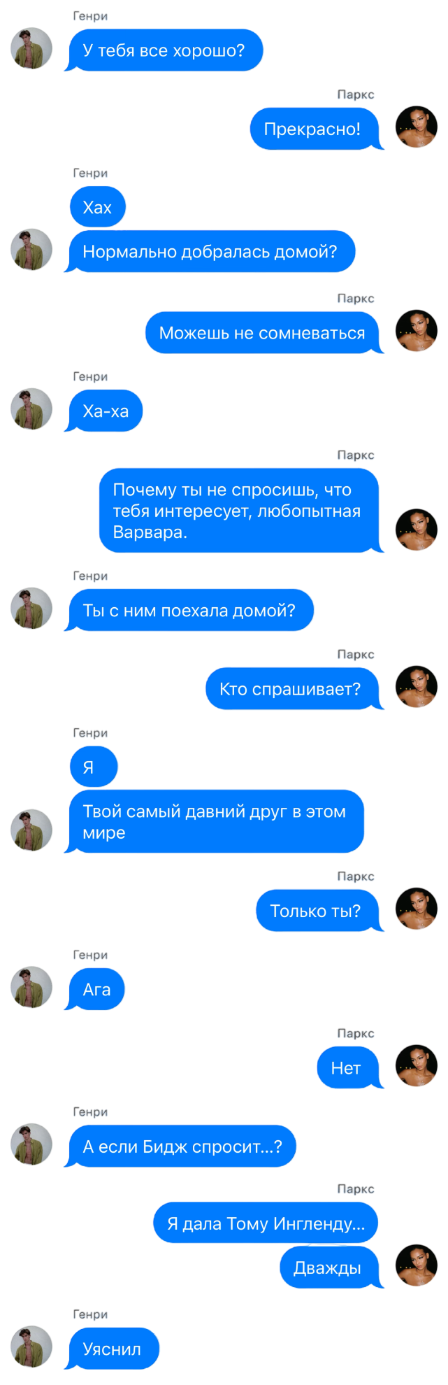 — Послушай, — Генри смотрит на неё с сочувствующей улыбкой. — У него есть твой номер? — он делает паузу. — Неважно — он всё равно не позвонит — он на один мат ближе к тому, чтобы превзойти Сэмюэля Л. Джексона по ругательствам.