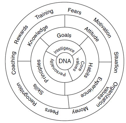 In Figure 4–2, it can be seen that there are things in a person’s DNA and in their early development—intelligence, personality, core values—that are very hard to change. And a person may change behavior a little for a little while. But if that change is at odds with the person’s inner fiber, eventually, they will snap back or be ineffective because their heart is really not in their actions. Thus these inner core traits are what you should really focus on in your hiring. In my experience, people usually have to bring these things with them.