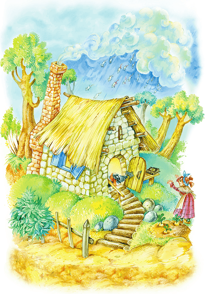 Маленькая Баба-Яга попробовала сделать дождь в четвёртый раз. Она повелела собраться в небе небольшой туче, подманила её рукой и, когда та остановилась над самой избушкой, крикнула: