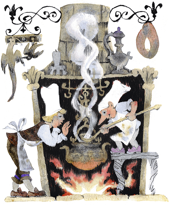 Так и было сделано. Всё принесли, но тут оказалось, что карлик едва может достать до плиты носом. Тогда к плите приставили два стула, положили на них мраморную доску, и маленький человечек взобрался на неё, чтобы показать своё искусство. Кругом расположились повара, поварята и другая кухонная прислуга. Все с изумлением смотрели, как быстро и ловко всё спорилось у него в руках. Когда все приготовления были окончены, он приказал поставить оба блюда на огонь и варить до тех пор, пока он не велит их снять. Потом он начал считать и, когда досчитал до пятисот, крикнул: «Стой!» Немедленно горшки были сняты с огня, и карлик пригласил смотрителя отведать его кушанье.