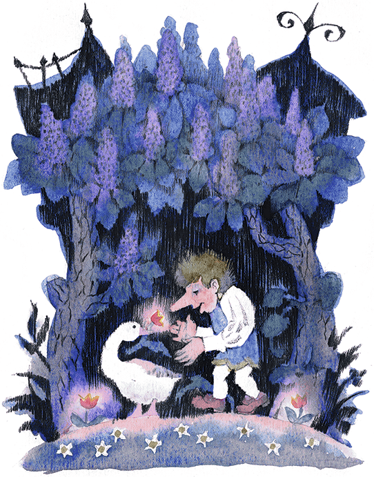 Гусыня полетела вперёд, а карлик побежал за ней, как только позволяли его маленькие ножки. Дерево отбрасывало большую тень, и кругом было так темно, что почти ничего уже нельзя было видеть. Но вдруг гусыня остановилась, от радости захлопала крыльями, опустила голову в высокую траву, что-то сорвала и грациозно поднесла это в клюве изумлённому карлику.