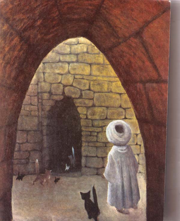Муку понравился кошачий обед, и он согласился. У госпожи Ахавзи (так звали старуху) было два кота и четыре кошки. Каждое утро Мук расчёсывал им шёрстку и натирал её драгоценными мазями. За обедом он подавал им еду, а вечером укладывал их спать на мягкой перине и укрывал бархатным одеялом.