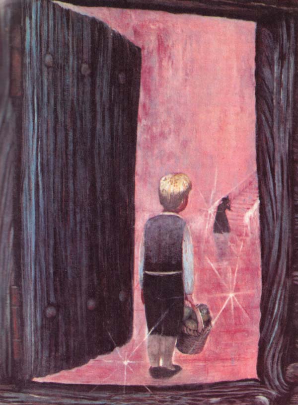 Якобу очень не хотелось идти, и он даже заплакал — он боялся этой страшной старухи. Но мать строго приказала ему слушаться — ей казалось грешно заставлять старую, слабую женщину нести такую тяжесть. Вытирая слезы, Якоб положил капусту в корзину и пошел следом за старухой.