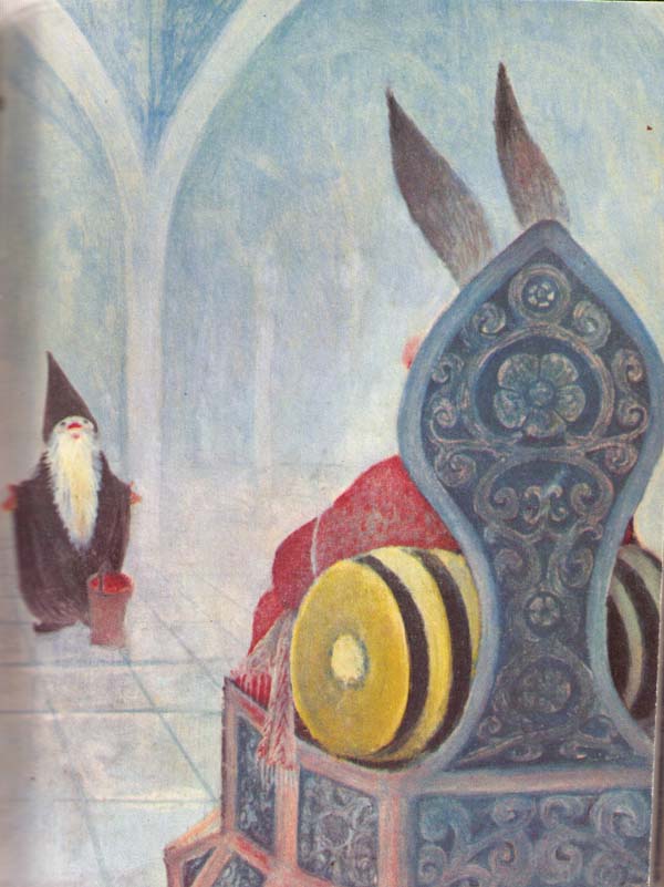 Старуха вынула из кармана какой-то заржавленный крючок, ловко всунула его в дырочку в двери, и вдруг дверь с шумом распахнулась. Якоб вошел и застыл на месте от удивления: потолки и стены в доме были мраморные, кресла, стулья и столы — из черного дерева, украшенного золотом и драгоценными камнями, а пол был стеклянный и до того гладкий, что Якоб несколько раз поскользнулся и упал.