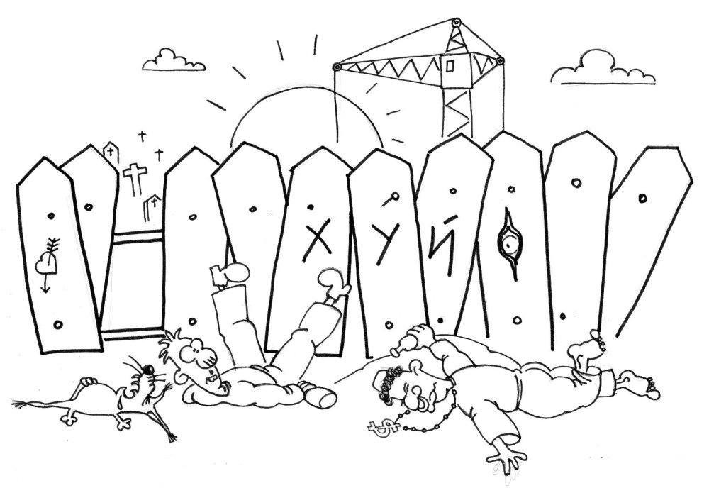 Предо мной возник старый деревянный забор, на котором чёрной аэрозолью было писано слово «ХУЙ» (большими буквами) и нарисовано нечто круглое, с какими-то точками. Нет, точки это у меня в глазах. Они мечутся бессистемно, напоминая о том, что уже давно надо подниматься и открывать те самые источники доходов для полноценного опохмела. Они правы, эти точки. Особенно после вчерашних негров и позавчерашнего кладбища.