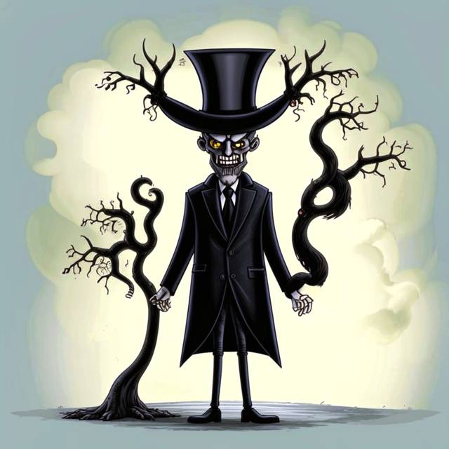 Из веток дерева вдруг образовалась человекоподобная фигура в чёрном пальто и котелке. Сорвав с носа росток листика, незнакомец поправил котелок и заявил: