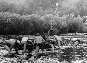 За день успели лишь связать плоты и вытесать гребь. Проходивший мимо катер поднял волну, которой эту гребь смыло за борт.