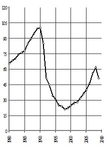 Рис. 21. Индекс капиталовложений в основные фонды в России, 1990 =100