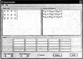 В Maple 10 построитель матриц Matrix Builder немного усовершенствован. В нем есть два окна просмотра созданной матрицы — одно для обычного вида матрицы, а другое в виде системы линейных уравнений (рис. 2.7) в котором последний столбец расширенной матрицы представляет столбец свободных членов.