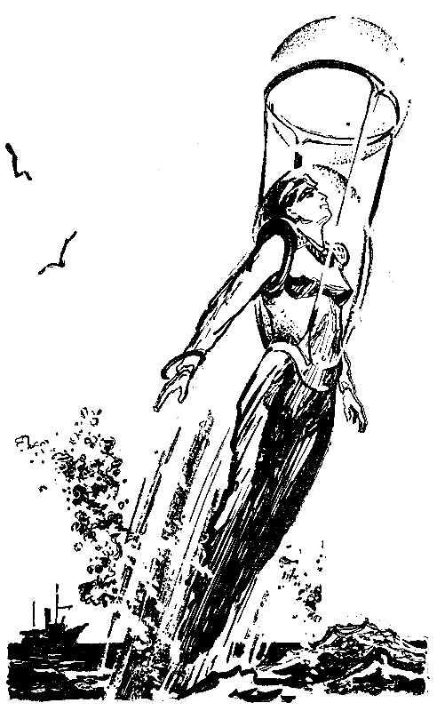 Ждать пришлось недолго. Опять показался серебристый пузырь, опять он всколыхнул и прорвал гладь океана, но на этот раз поднялся в воздух очень высоко, увлекая за собой, к нашему удивлению, тонкую женскую фигуру. Она медленно опустилась на воду, а через мгновение уже была на борту яхты. Вокруг стеклянного шара, выше его экватора, было прикреплено кожаное кольцо, от которого свисали длинные ремни, привязанные к широкому кожаному поясу, охватывающему тонкую талию женщины. Выше пояса голова и плечи ее были заключены в оригинальный грушевидный стеклянный колпак, — я называю его стеклянным, но он был из того же легкого упругого материала, похожего на стекло, что и шары. Колпак был совершенно прозрачный, с легкими серебристыми прожилками.
