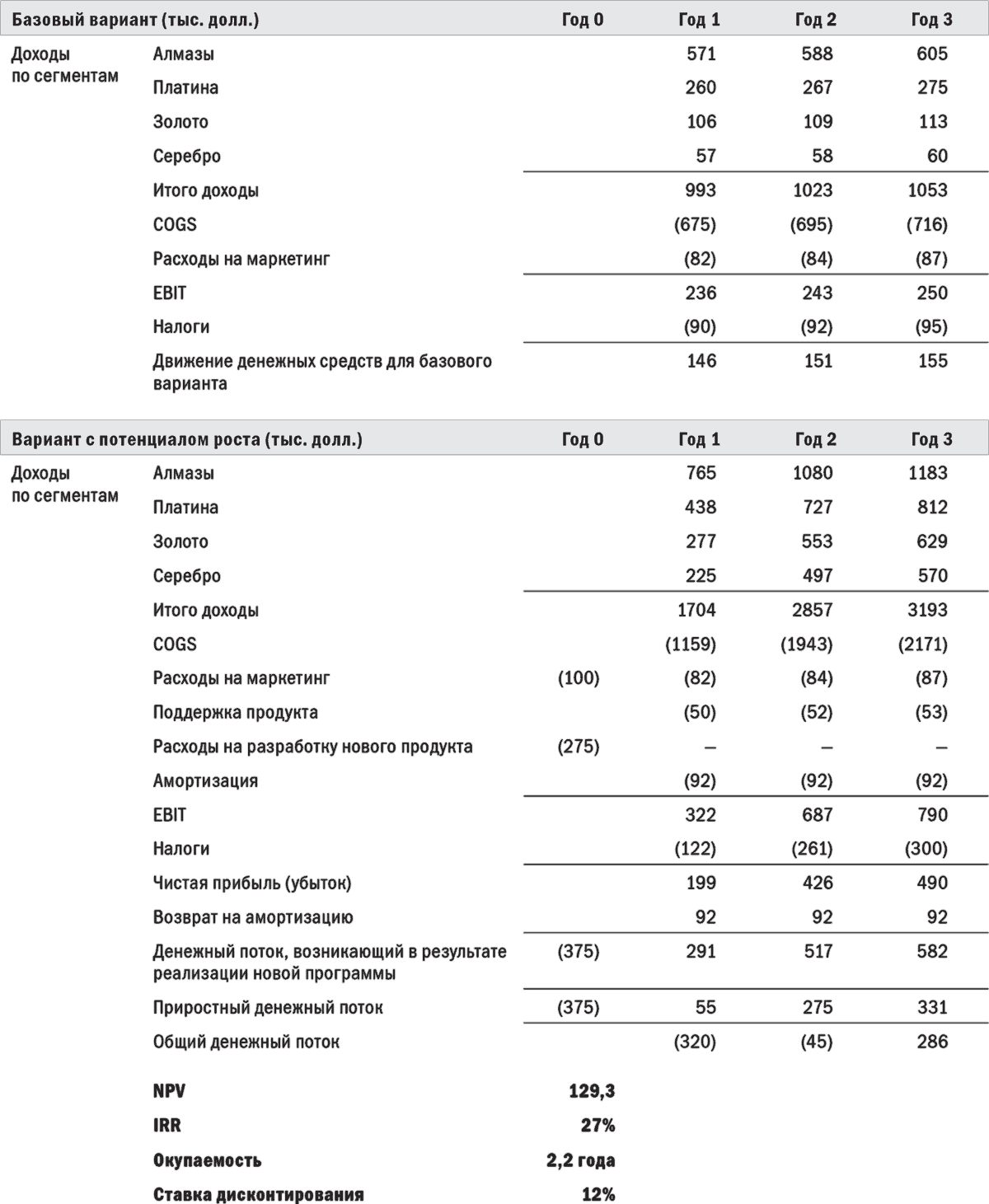 С учетом данных о доходах и расходах для базового варианта, расходах на развитие нового продукта и маркетинг, связанный с запуском, а также расчетах по приросту дохода от новой инициативы вы можете заполнить шаблон, приведенный в табл. 5.3 (готовый шаблон – см. табл. 5.6). В результате вы можете получить прогнозируемые величины денежного потока для запуска нового продукта. В базовом варианте (верхняя часть табл. 5.5) доходы компании растут на 3 % в год (это можно считать индикатором естественного роста компании). В нижней части таблицы приведен расчет с учетом предположений о доле рынка и доходах и затрат на разработку и запуск нового продукта.