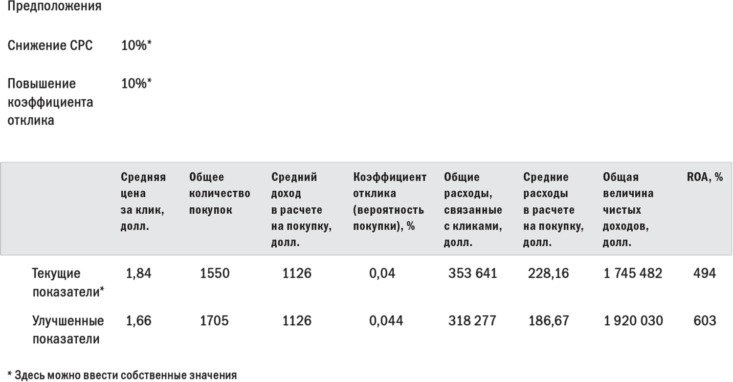Табл. 7.2. Шаблон для оценки влияния на ROA снижения CPC и повышения коэффициента отклика для типичной рекламной кампании в Google