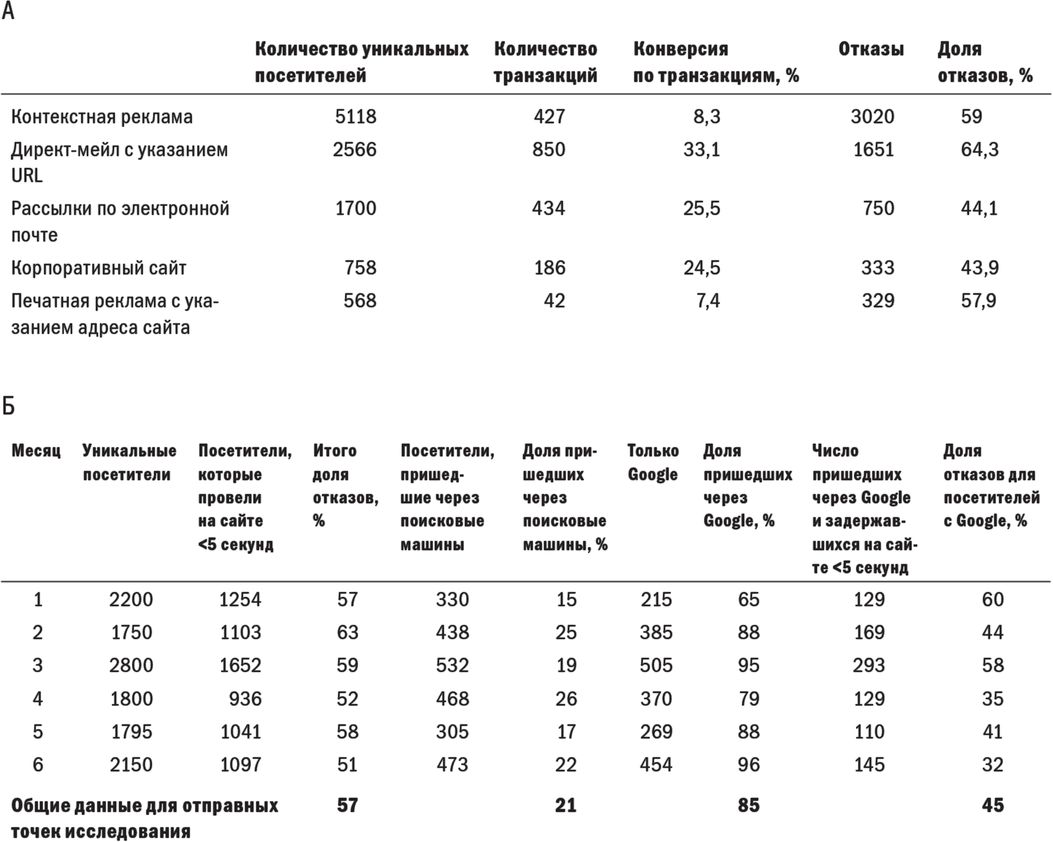 отрезок в пять секунд, но здесь нет никаких жестких правил: если вы считаете, что для вашего сайта более уместны 10 секунд, то нет проблем. Доля отказов для сайта – коэффициент оттока, то есть основной показатель № 3. Лично мне он очень нравится, ведь в комбинации с другими показателями он помогает увидеть общую картину того, что работает, а что – нет.Например, в табл. 7.3A сравниваются различные типы рекламных средств: контекстная реклама, печатная реклама, рассылки по электронной почте, директ-мейл и показ рекламы на корпоративном сайте. Все они призваны направить потенциальных клиентов на определенный сайт, разработанный специально для конкретной кампании. Если бы вы рассматривали только показатель CTR, то пришли бы к заключению, что наиболее эффективен директ-мейл, а на втором месте – рассылка по электронной почте. Однако стоит нам добавить дополнительный показатель (долю отказов), и мы увидим, что у директ-мейла самая высокая доля отказов – 64,3 %. Корпоративный сайт имеет наименьшую долю отказов (43,9 %). Это дает основания считать, что он обеспечивает релевантный трафик. Высоки показатели и у электронных рассылок – доля отказов составляет 44,1 %.
