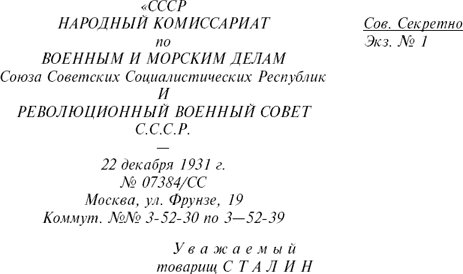 Докладная записка М. Н. Тухачевского И. В. Сталину, хранящаяся в Российском государственном архиве социально-политической истории, предлагается вниманию читателей26.