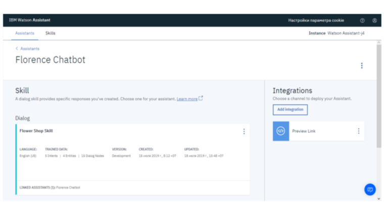 выберем навык «Цветочный магазин», нажав на него.Теперь, помощник Florence Chatbot связан с навыком цветочного магазина.