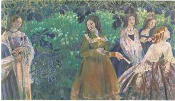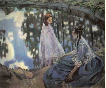 Невеста — это слово заставляет нас понять тот восторг, который охватил живописца, изобразившего, как его любимая и сестра беседуют у пруда.