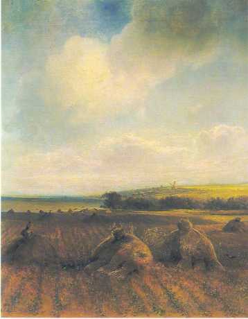 «Степь днем». Этот пейзаж — новое слово в живописи. Лучезарное, широкое приволье напоено светом и радостью. Бескрайние дали тают в жарком мареве. Где-то в голубой выси вьется жаворонок.