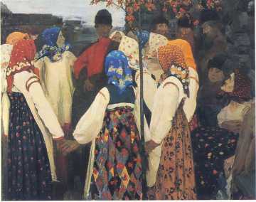 «Нынче вечером, — пишет Рябушкин, — у меня собирается беседа. Придут Наталья, Марья, Ганя, Аннушка и Ириша… Они придут с прялками, а я купил в Петербурге тальянку. Товарищ мой здорово играет на балалайке..Всего лишь посиделки, но для живописца это был бесценный материал для раздумий, наблюдений. Именно образы этих белокурых светлоглазых девушек с деревенских вечеринок вошли в его ставшие позже знаменитыми полотна. А потом ведь там звучали песни.