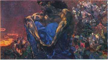 этой глубоко жизненной драмы чарует гармоничностью пропорций, ракурсов, колорита, виртуозным мастерством живописца.Можно только поражаться, как люди, понимающие и любящие искусство, не услышали в работе странного и для многих непонятного живописца голос предтечи, вещавший новое, доселе невиданное развитие русского искусства. Ведь в этом полотне при всей его своеобычности, как ни в одном другом произведении современников Врубеля, отчетливо проступает великолепное владение всеми традициями мировой культуры. В колорите холста слышны звуки мелодий несравненных венецианцев, а в лепке формы угадываются ритмы самого великого флорентийца Микеланджело Буонарроти.
