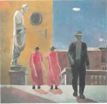 Густое синее небо с одиноким висящим белым крохотным облачком. Цвета сиены глухая стена с окошком-иллюминатором, античная скульптура, красно-розовые монахи в черных головных уборах, рабочий с серым молодым лицом и бегущие горячие тени — это квинтэссенция, написанная живописцем без тени гротеска, но предельно колюче и раскрыто.