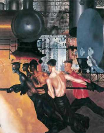 И такой же молодой художник Дейнека с увлечением рисовал прозрачные конструкции новых цехов, шлак и шпалы у строящейся железнодорожной ветки, крепких мужиков и баб с многочисленных строек первых пятилеток…