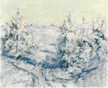 Посреди листа — ровный кружок, размером с ноготь. Художник, продолжая улыбаться, подносит его к холсту и прислоняет к пылающему розовому снегу.