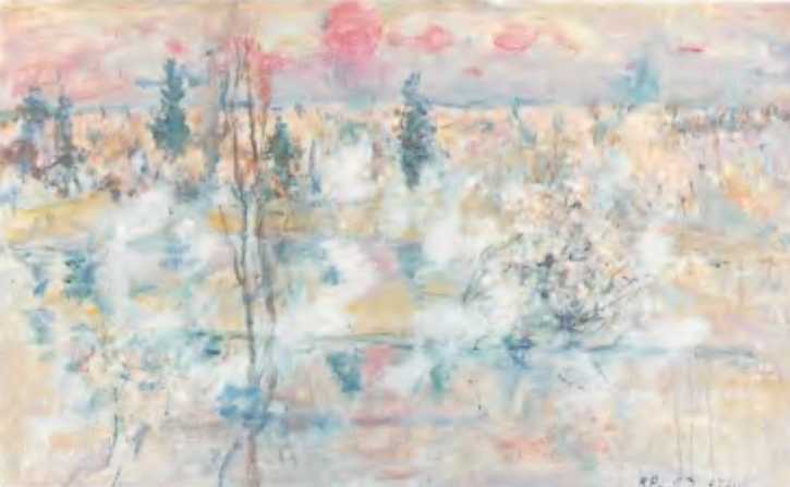 Половодье. Любимая тема художника. Зеленая пойма. В тихих водах плавают сиреневые, розовые облака, пушистые купы цветущих верб. Пейзаж написан будто с птичьего полета.