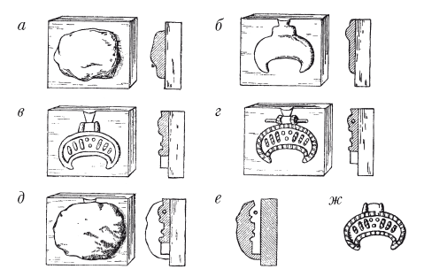 Процесс отливки украшений, применявшийся в те времена (восстановленный Б. А. Рыбаковым), показан на рис. 2.1. Применение восковых моделей подтверждается сложностью отливок, диктующих необходимость разрушения формы для извлечения отливки, тонким орнаментом на поверхности, как бы вырезанным резцом и, в особенности, отпечатками пальцев мастера, лепившего восковую модель, обнаруженными на некоторых литых изделиях.
